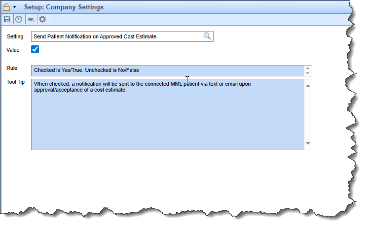 The "Send Patient Notification on Approved Cost Estimate" company setting allows a practice to notify the patient when the practice has approved a patient cost estimate. When set, it will send an MML message informing the patient that a new estimate has been added to their MML account.