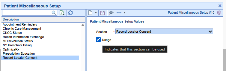 - Required: Set up 'Record Locator Consent' Usage Checkbox - This setup item exists within Setup > Patients > Gear > Setup > Miscellaneous > 'Record Locator Consent' and typically requires an Practice Admin to modify depending on existing role configurations.