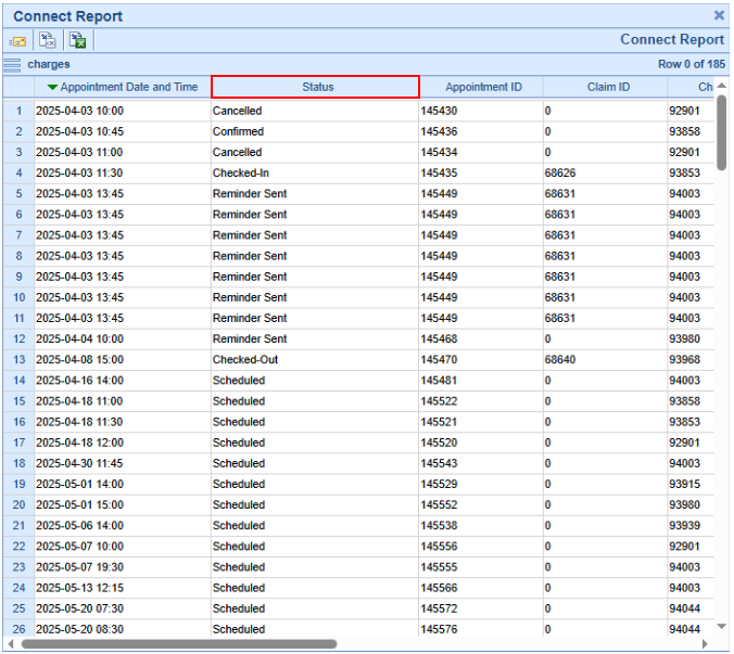U20745: We updated the "Charges by Appointment Type" Connect Report to include appointments regardless of whether a claim is attached. This enhancement helps users identify procedures for which claims have not been documented. All appointments within the specified date range and appointment type search parameters are now displayed, even without an associated claim. Additionally, "Appointment Status" has been added as a display field to indicate canceled appointments