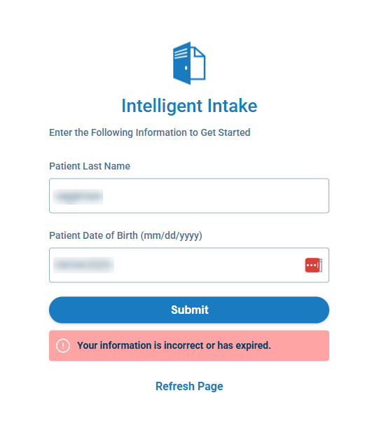 B20915: Corrected an Intelligent Intake issue that prevented some patients (intermittently) from accessing the intake form via an Intake Link when providing their last name and date of birth. This caused the patients to receive an incorrect information error (or expired link) despite supplying accurate information. Error message login has been added to assist with identifying the causes of the intake link access fails.