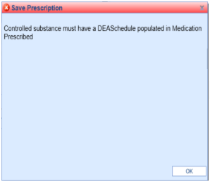 B20435: We corrected an issue that would produce an error message when prescribing Gabapentin 100mg capsules. The error message “Controlled Substance must have a DEASchedule populated in Medication prescribed” was due to a sorting issue that was causing an expired NDC# to be associated with a prescription.