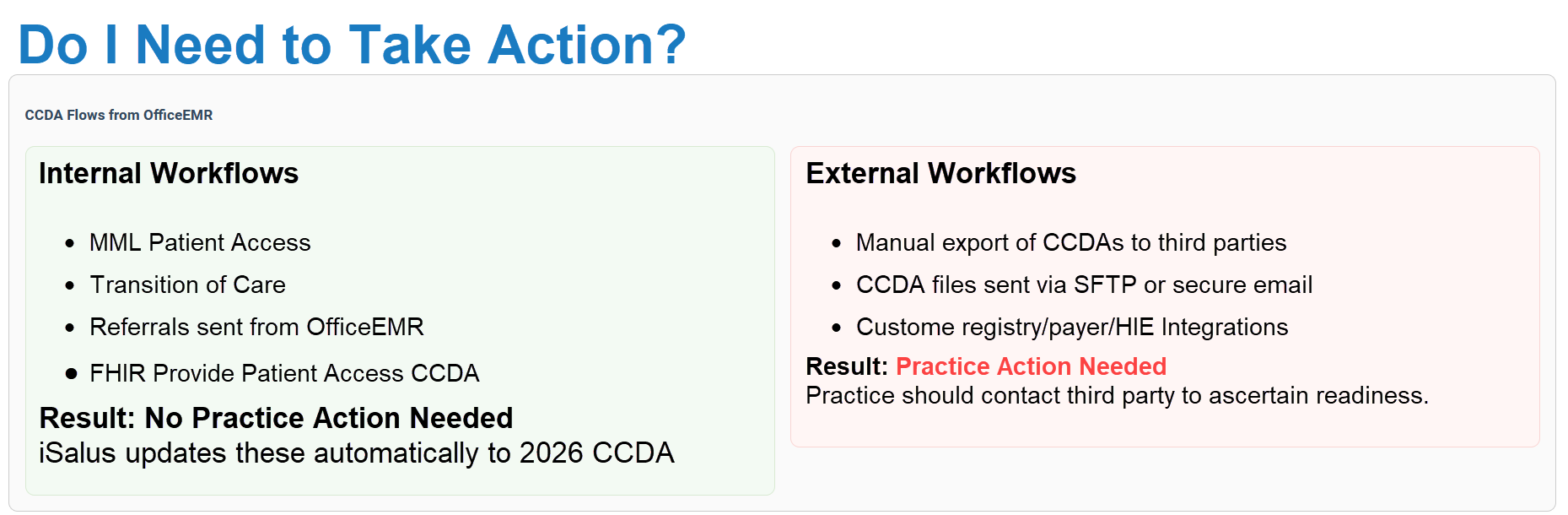 If you only use standard OfficeEMR workflows (MyMedicalLocker, transitions of care, referrals, and FHIR-based patient access), the CCDA 2026 transition will be handled by iSalus automatically. However, if your practice sends CCDA files to systems outside of the standard OfficeEMR workflows, then action will be required to ensure the entities that you share your data with are ready for this new 2026 format.