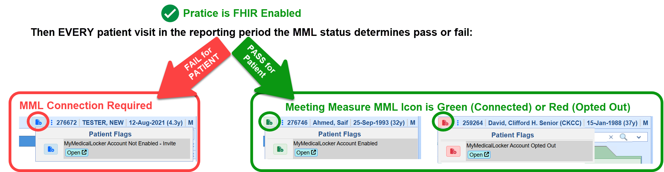 - To pass the measure each patient visit in the reporting period must show that the patient is Connected to MML or Opted Out of MML